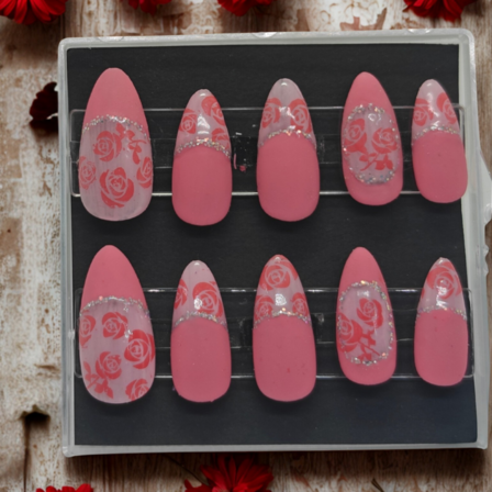 Rose inspired with pink roses with silver shimmer, handmade press-on nail set, matte and glossy finish.