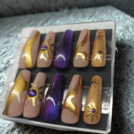 Gold Egyptian inspired with purple shimmer, handmade press-on nail set
